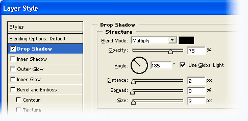 To add the drop shadow to your images, double-click on the image's layer in Photoshop and select Drop Shadow. Then change Angle to 135, Distance to 2, and Size to 2. The drop shadow is black at 75% opacity.